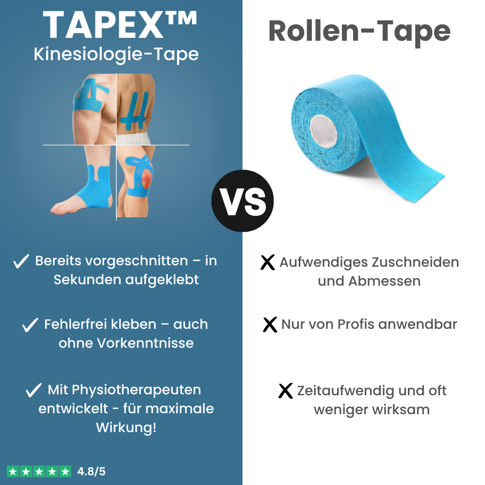 Mit TAPEX brauchst du keine Tape-Erfahrung: Dank dem vorgeschnittenen Spezialdesign gelingt die Anwendung immer richtig – ohne Zuschneiden, ohne Fehler. Für sofortige Stabilität, spürbare Entlastung und maximale Wirkung.