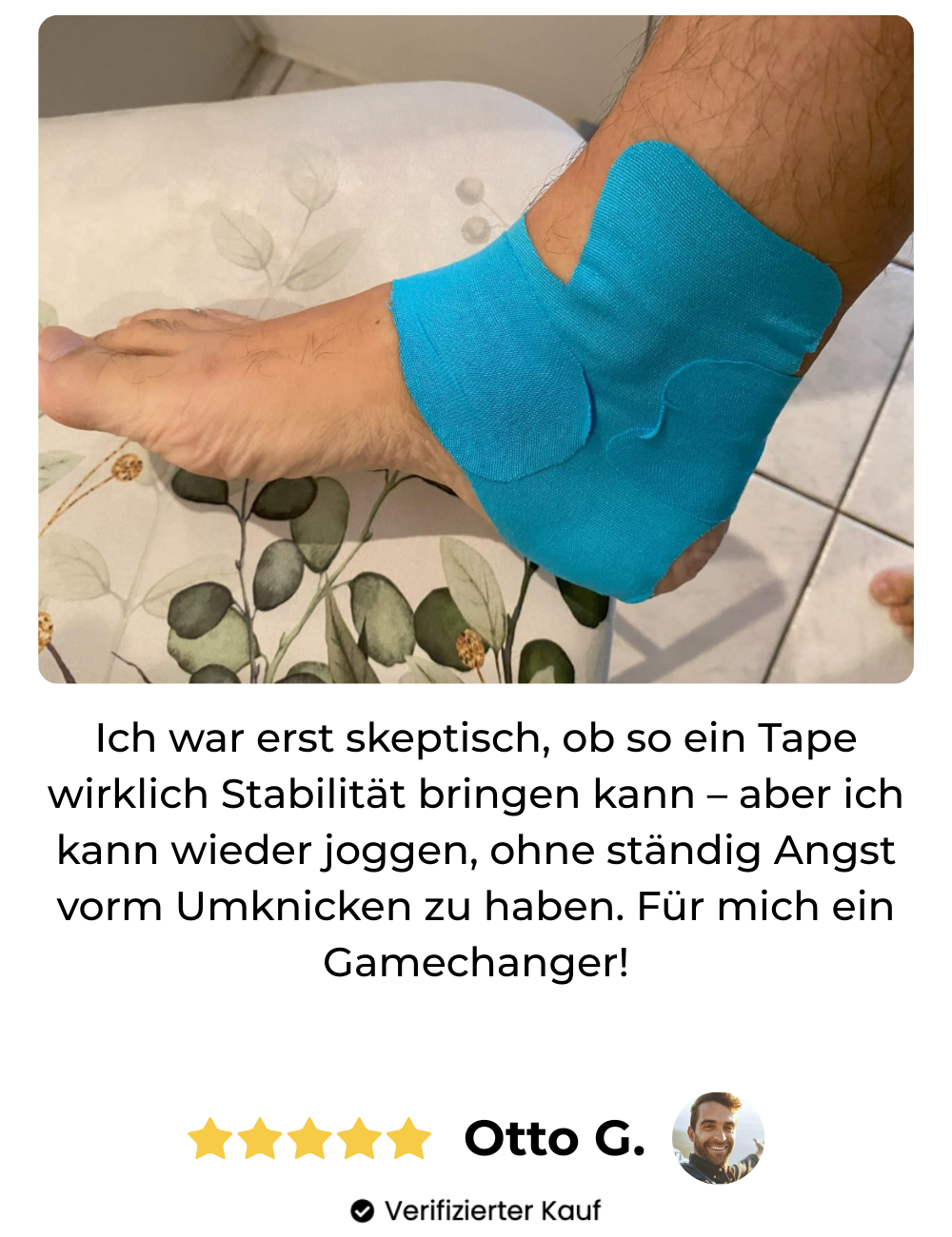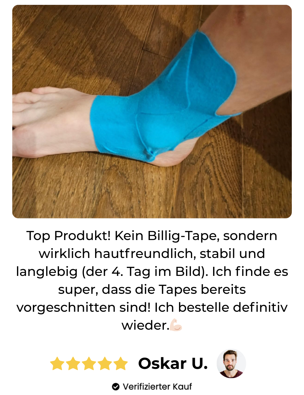 Ziehe das Tape nur leicht straff es soll stabilisieren, nicht einschnüren. Achte darauf, dass es angenehm sitzt, die Durchblutung nicht einschränkt und keine Falten wirft.