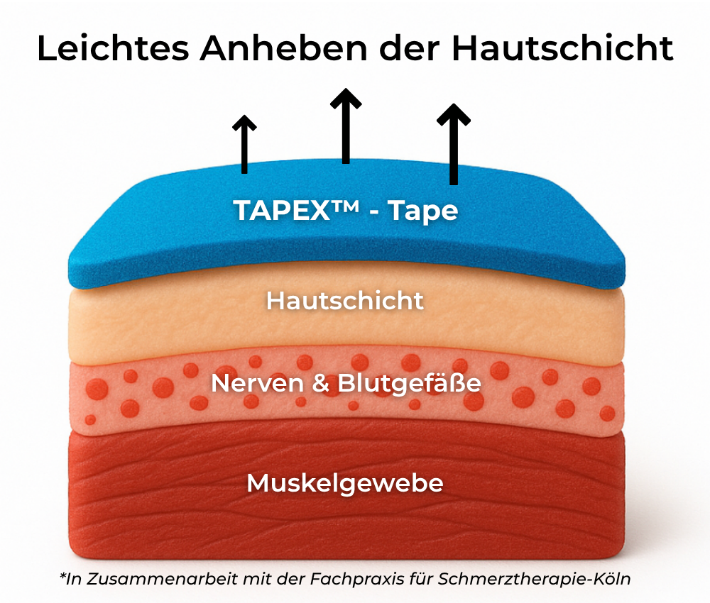 Beim Aufkleben hebt das Tape die Haut sanft an und schafft dadurch mehr Raum im Gewebe.